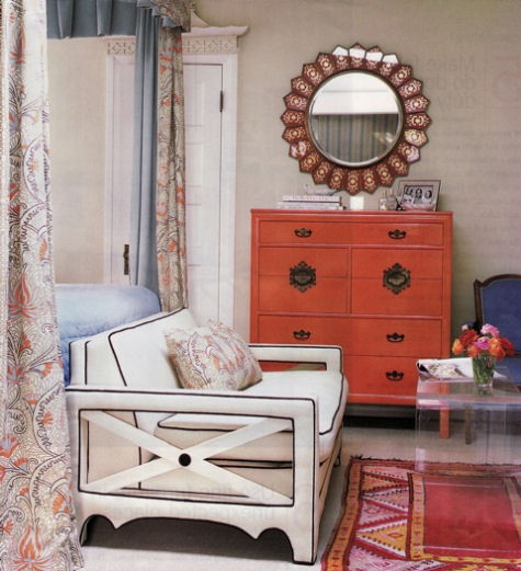 hmmmm . . . detect any themes? i adore the idea of a 4 poster with drapery panels, but i'm not sure we can get past the fan (and, i'm sorry, but fans are just practical in bedrooms, so it's probably staying). still thinking perhaps some drapery over a headboard, but those are tough to execute without looking cheesy, so we'll see. we'll definitely need a short desk as one of the bedside tables, a charming 3-drawer dresser with a large mirror situation, we both loooove the idea of a small chaise (in a pop color maybe??), and lots and lots of layering of pattern and texture.